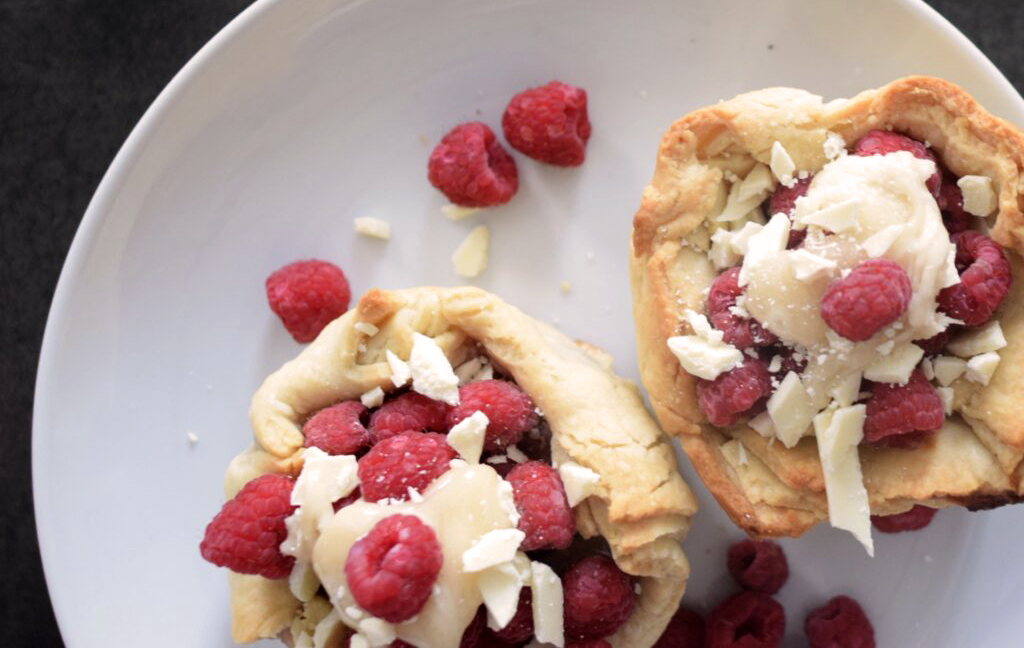 Once fully dried and hardened, chop apart into decorative pieces. - As the pies have cooled and set, top with fresh raspberries, white chocolate pieces, and drizzles of whipped honey.
