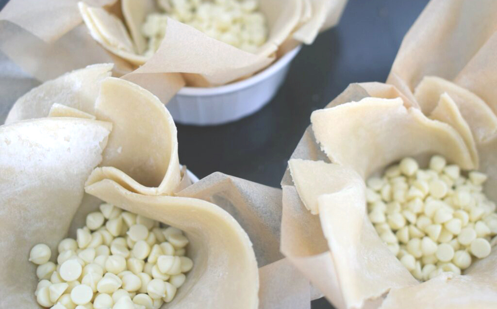 Next, fill each ramekin with a Wick’s Dough Circle – if you want SMALLER hand pies, divide each crust into the desired size. - Take HALF of your white chocolate chips and divide them among the hand pies, sprinkle them onto the crust to create a bottom layer.