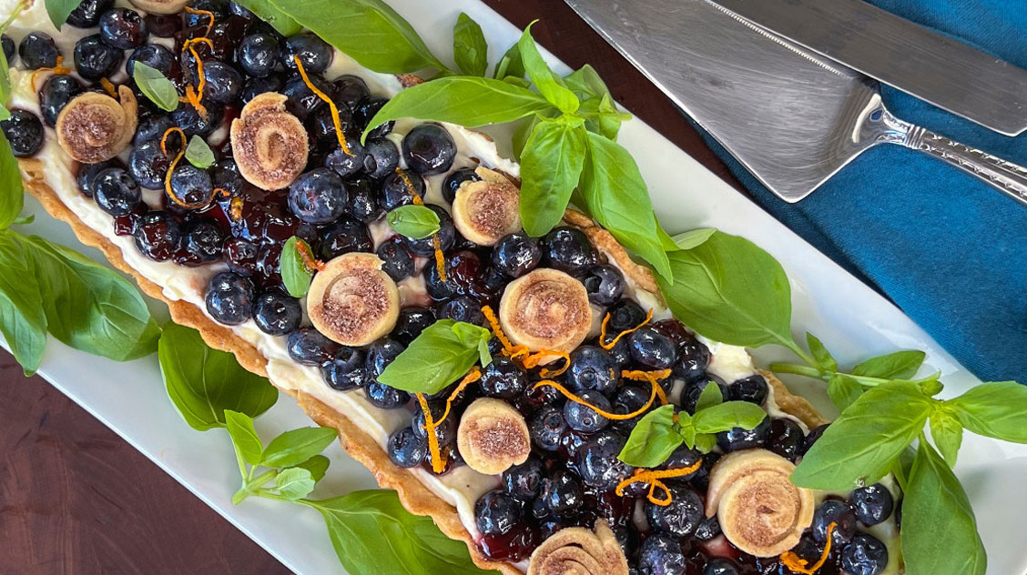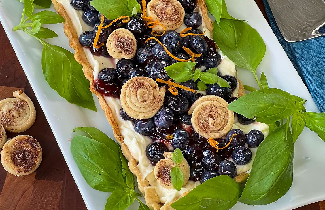 Meanwhile, in a standing electric mixer, or by hand, whisk all Citrus Mascarpone Filling ingredients, until smooth. Once the tart shell has cooled, spoon in the mascarpone filling and top with jam sweetened blueberries. Garnish with basil and orange zest.