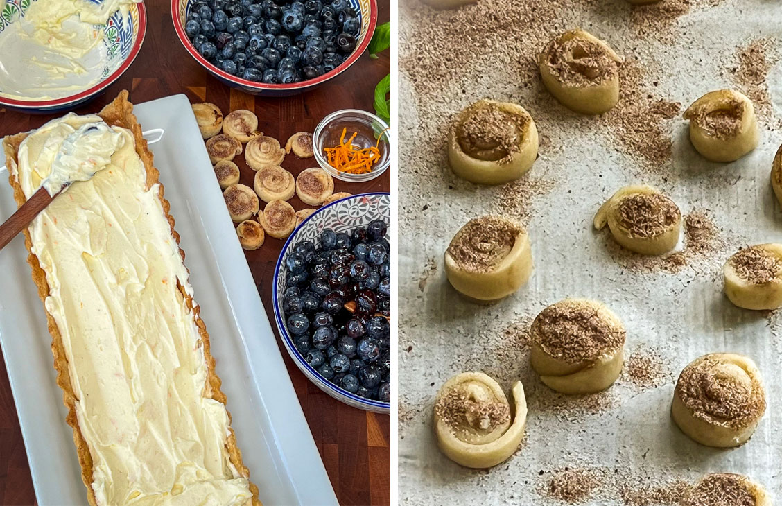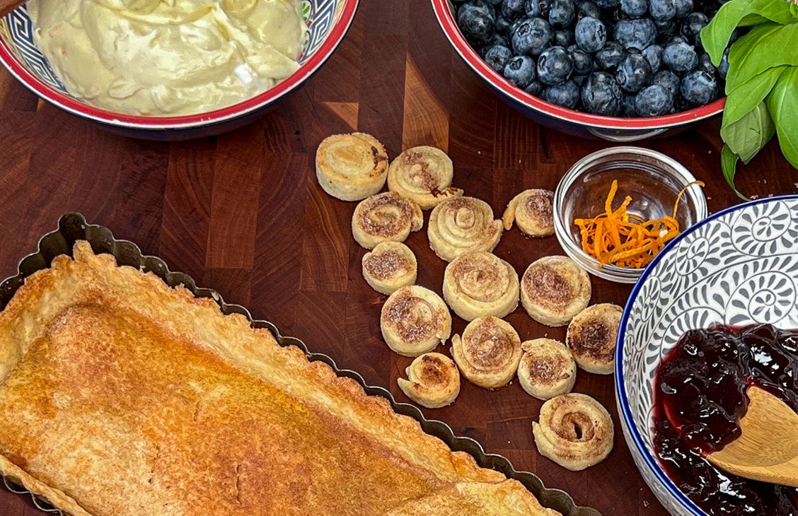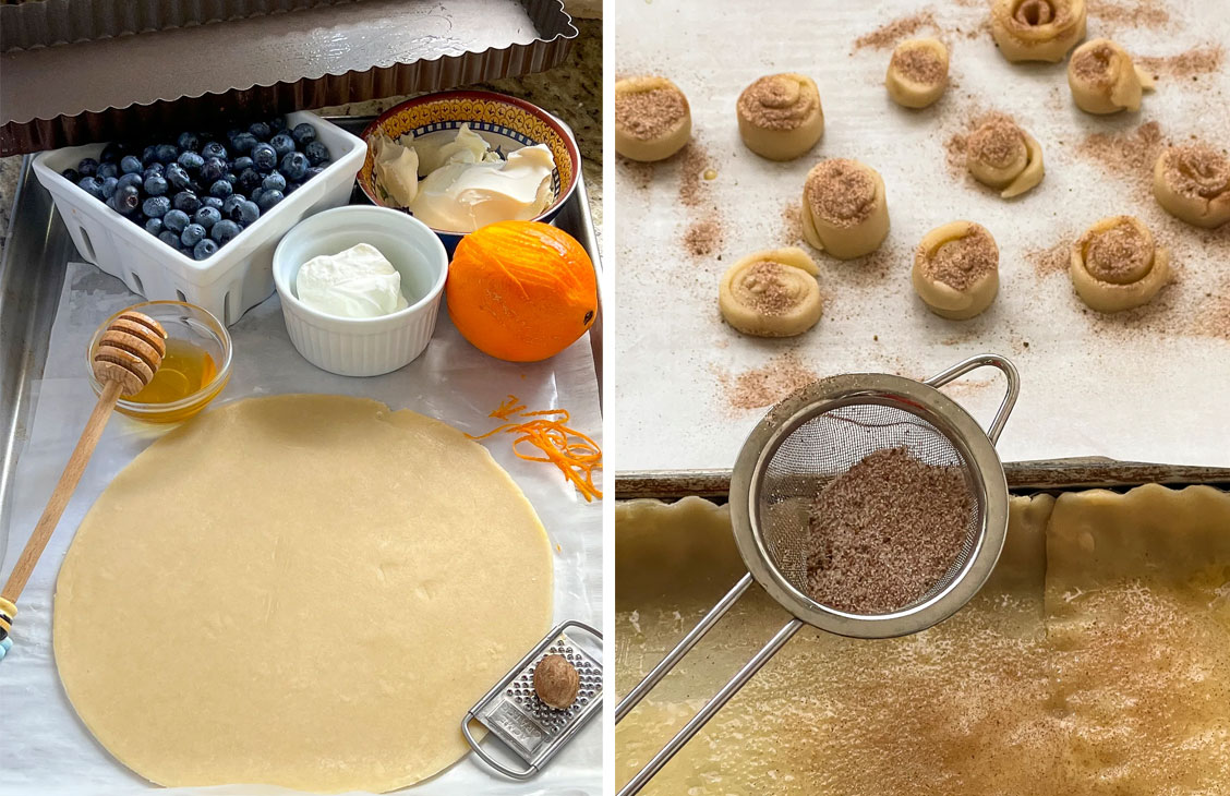 This impressive combination of mascarpone, orange zest, honey, berries, and nutmeg blend into a creamy decadent texture that is not overly sweet. Bright blueberries are coated in top-shelf raspberry preserve for a punchy flavor that is super easy to create. Top it all off with cinnamon-nutmeg pie crust swirls for the ultimate party-ready presentation.
