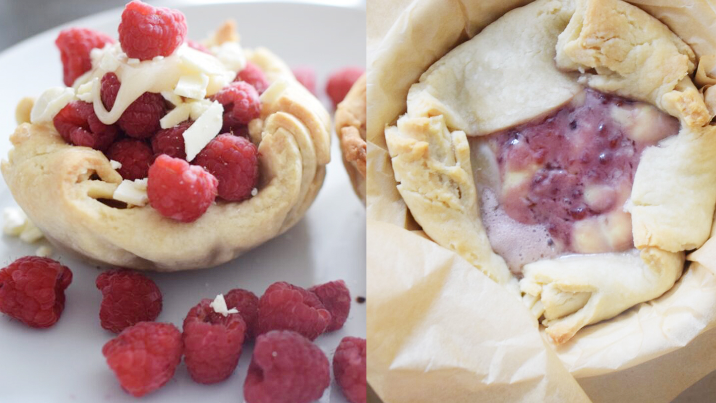 - As the pies have cooled and set, top with fresh raspberries, white chocolate pieces, and drizzles of whipped honey.